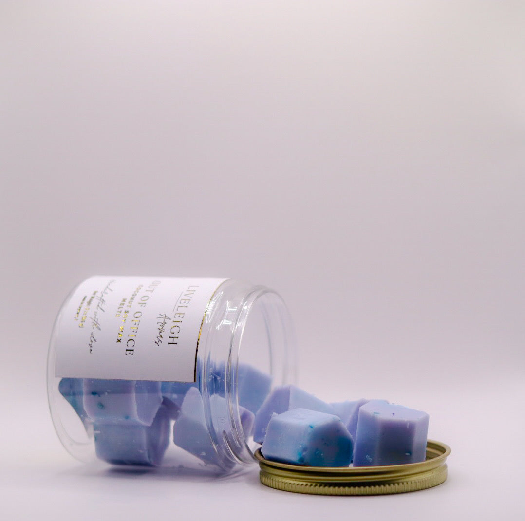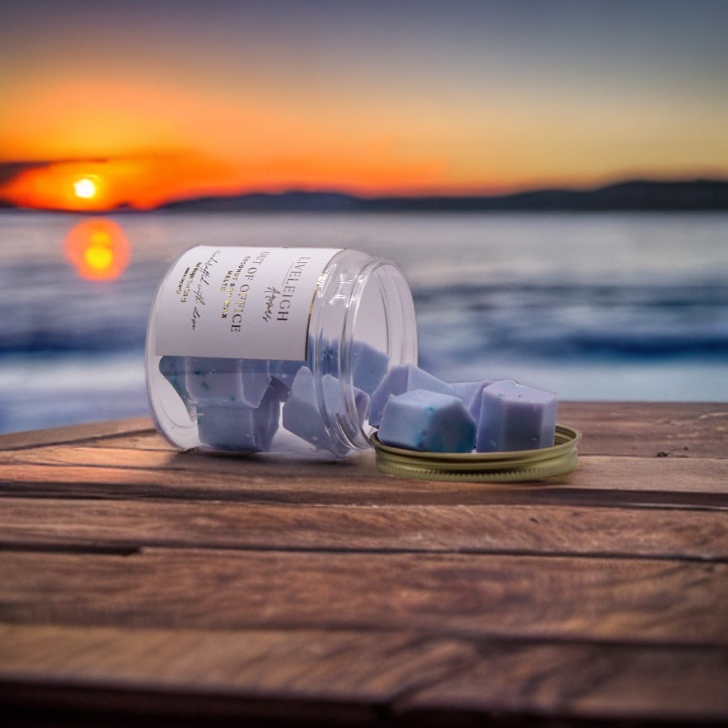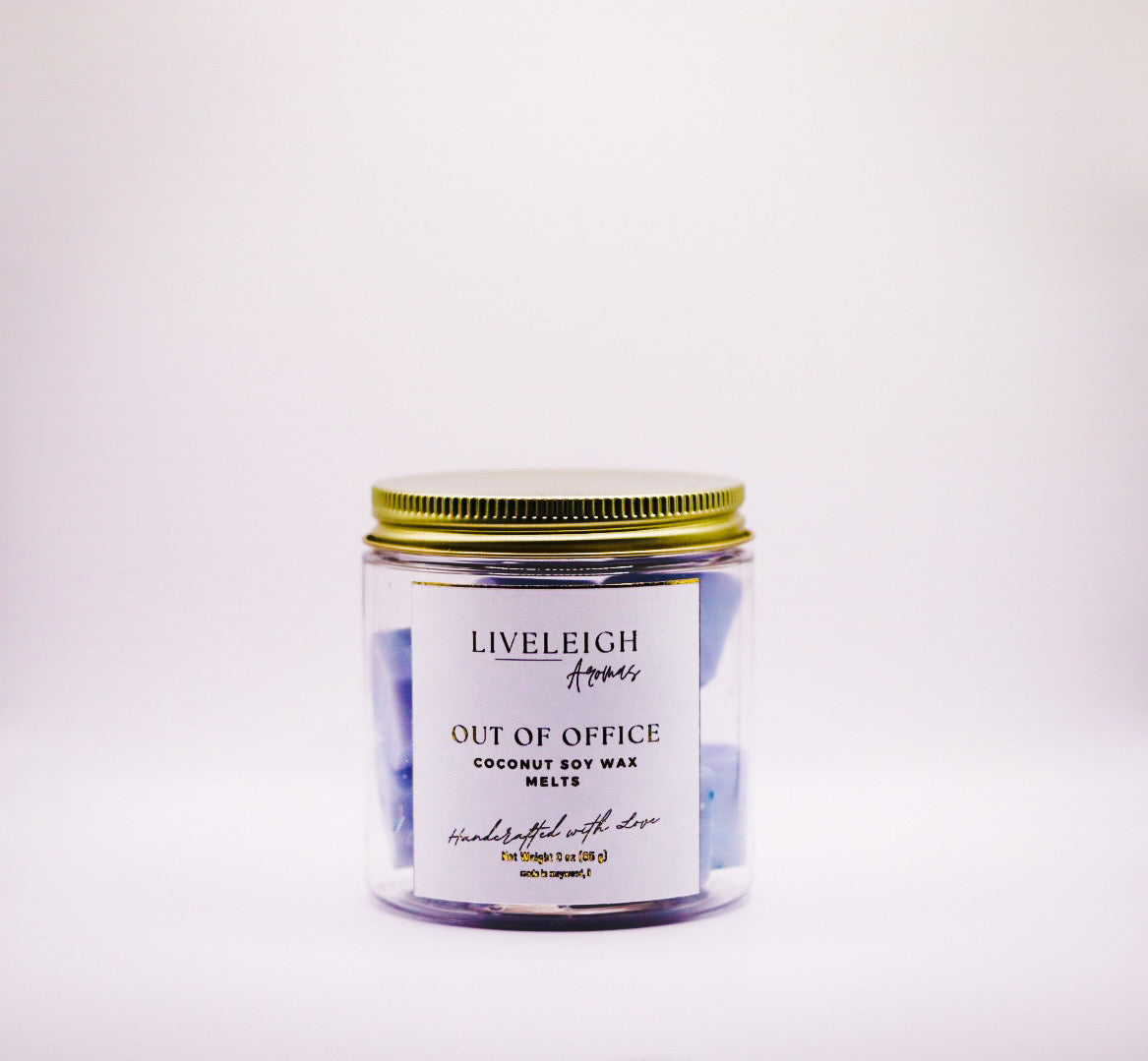 Out of Office Coconut Soy Wax Melts: A Sensory Retreat with Bergamot, Powder, Leather, Lavender, Vanilla, Ylang Ylang, Teakwood, Amber, Musk, and Sandalwood Scents