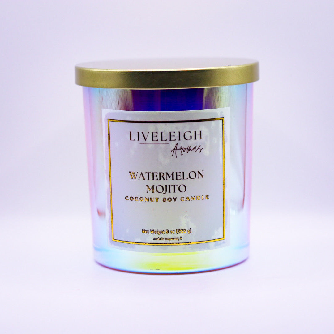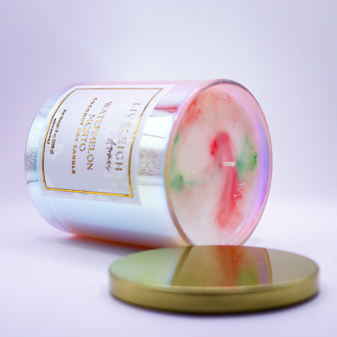 Our Watermelon Mojito Coconut Soy Candle is hand-poured into a stylish and reusable glass container, adding a touch of elegance to your home decor.